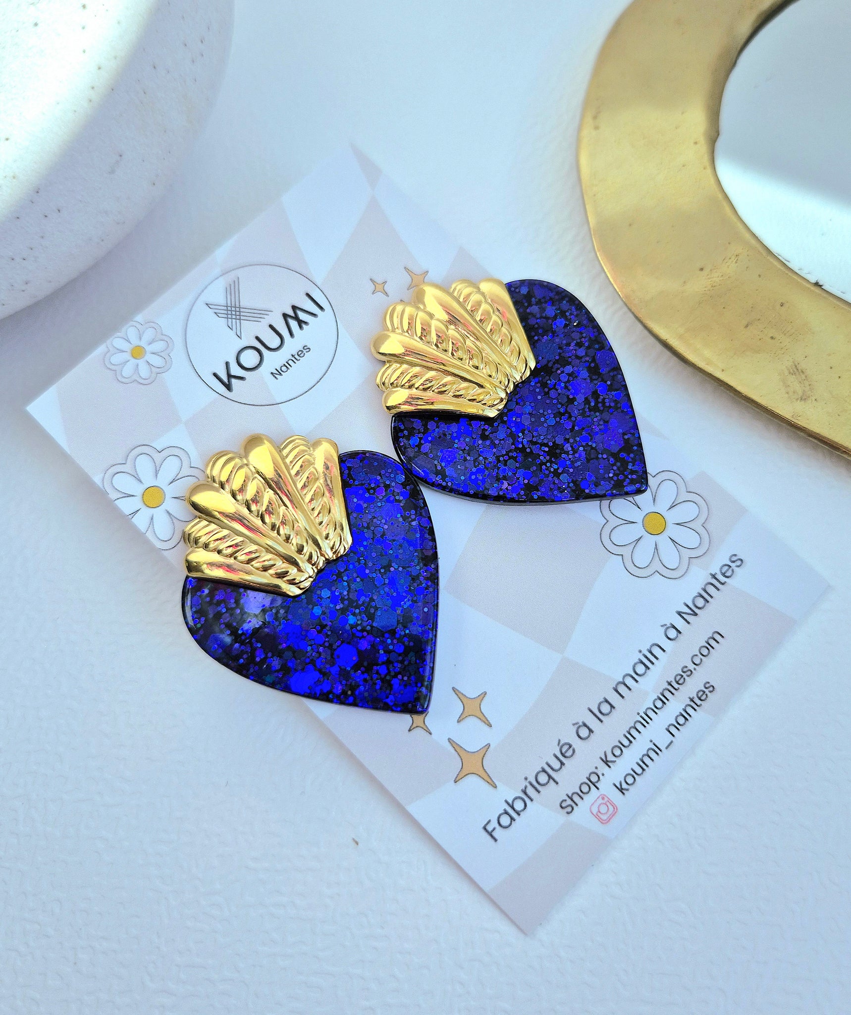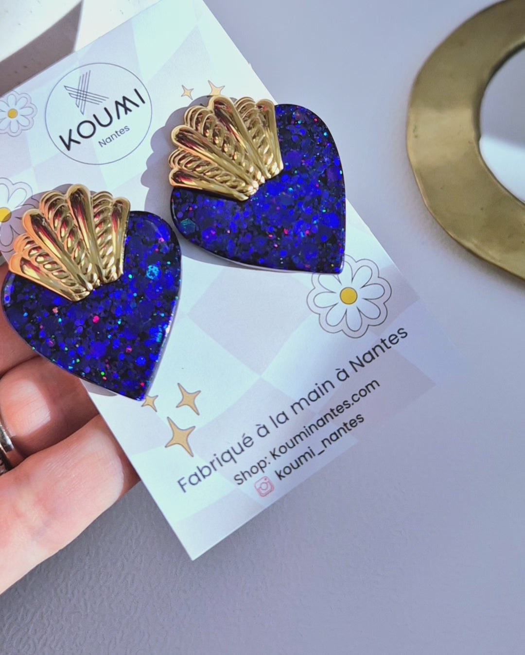 Ces boucles sont en acier inoxydable et résine biosourcée pailletée.