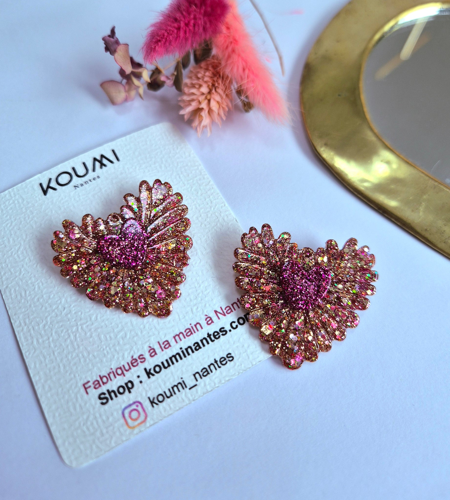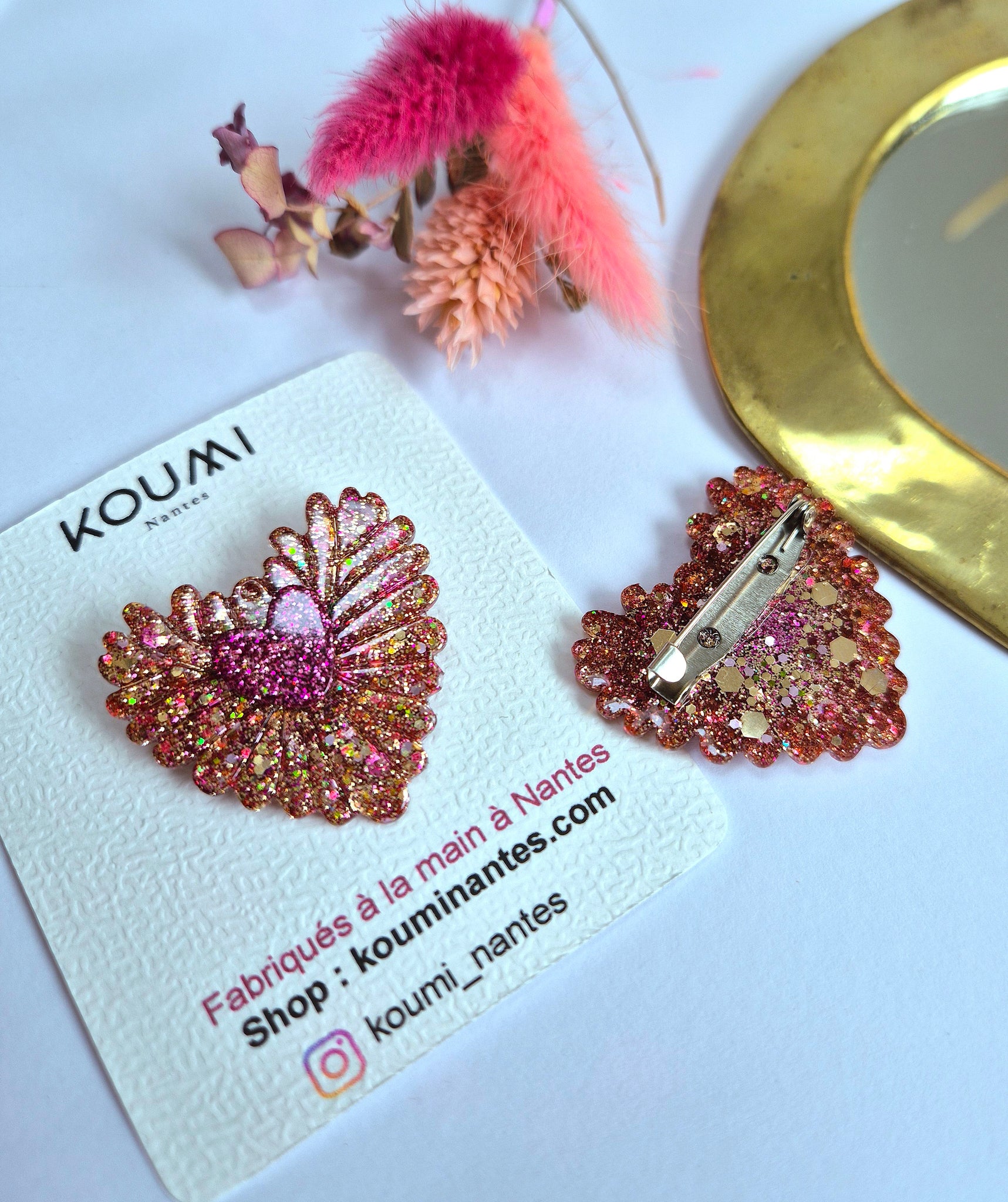 Ajoutez une touche de magie à votre style avec notre broche Cœur ex voto. Fabriquée à la main en résine, cette broche est une explosion de paillettes roses, fuchsia et dorées qui captent la lumière sous tous les angles.