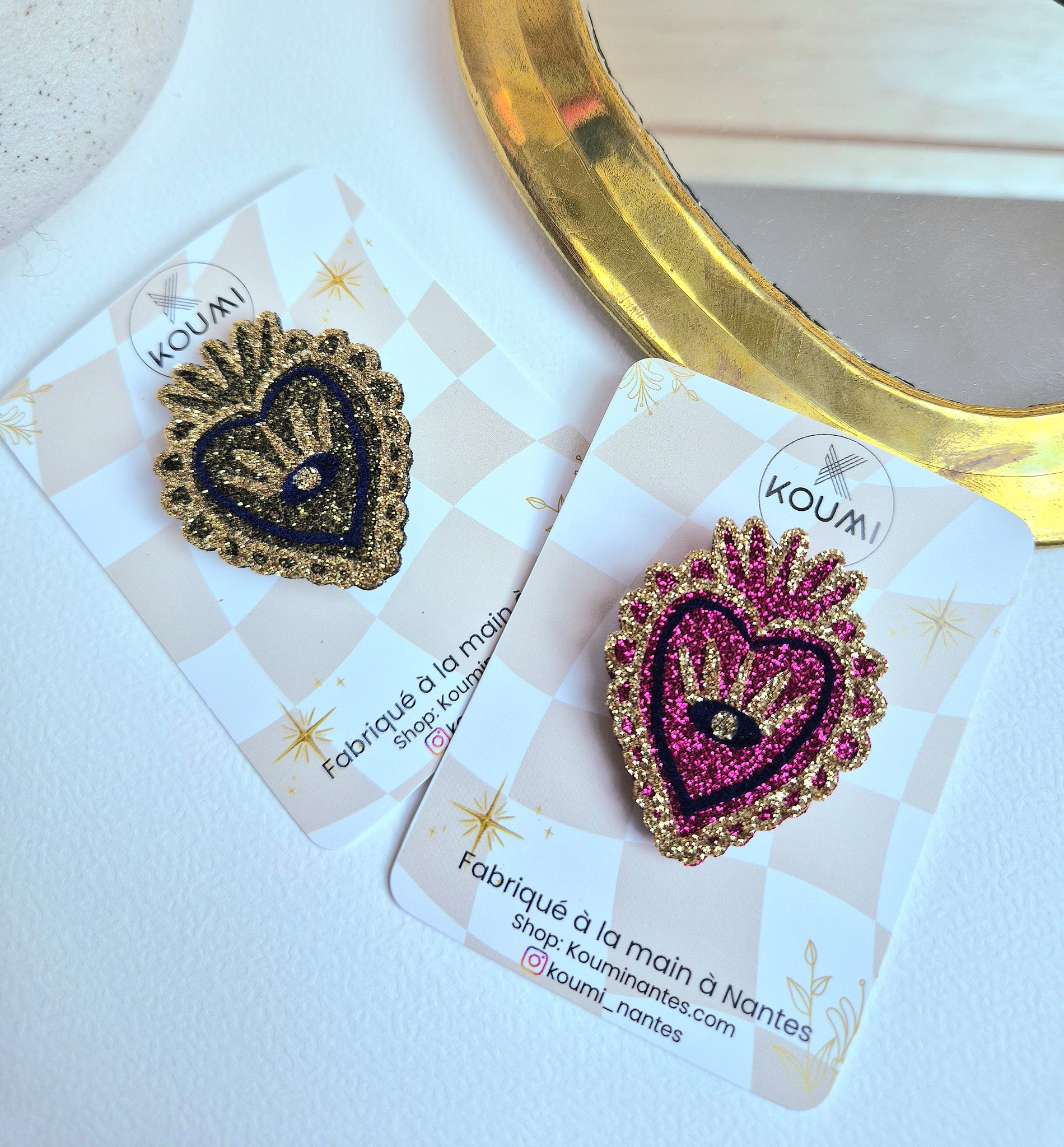 Ajoutez une touche de magie à votre style avec notre broche Cœur ex voto. Fabriquée à la main en feutrine et paillettes, cette broche est une explosion de paillettes et captent la lumière sous tous les angles.