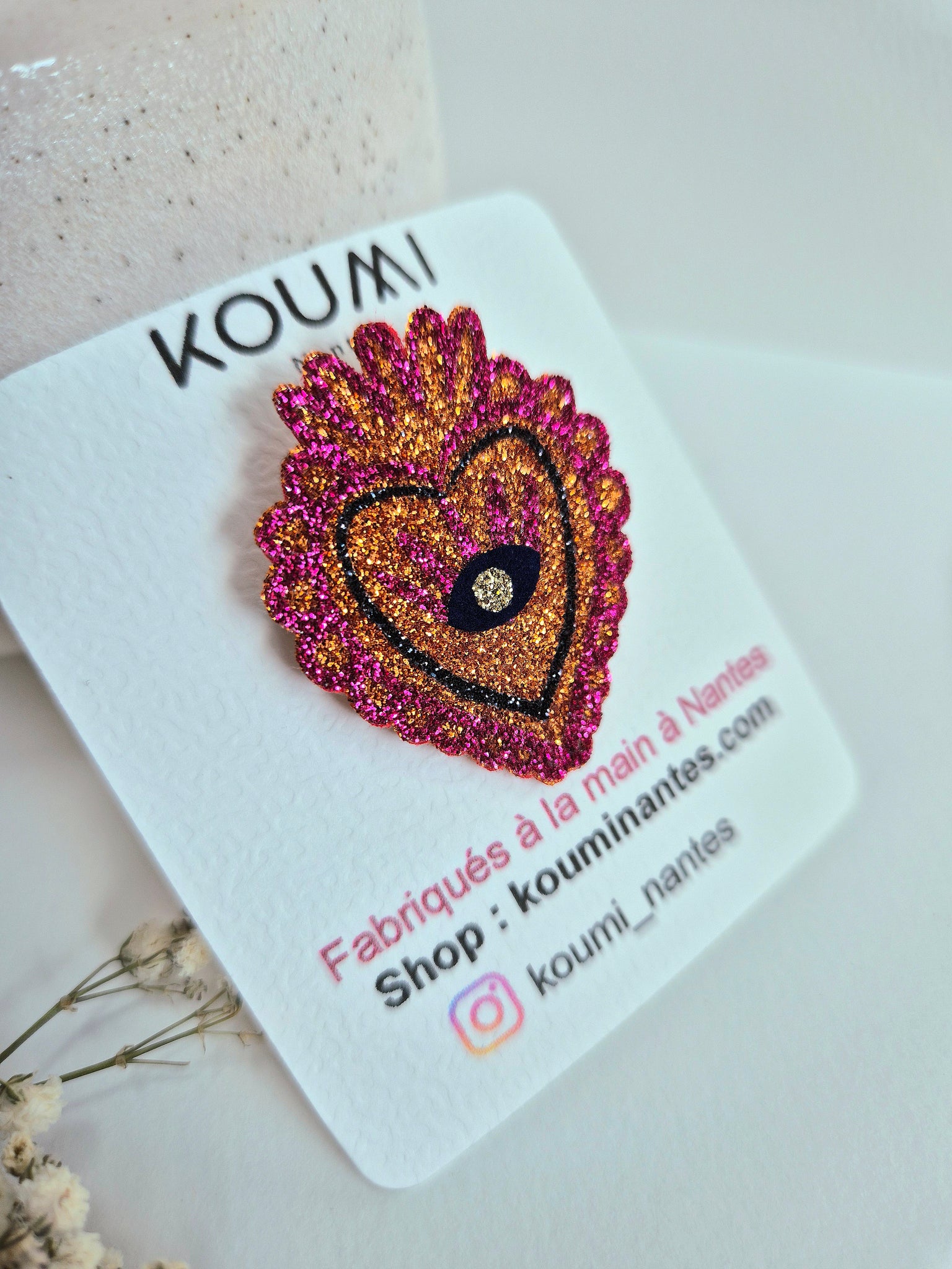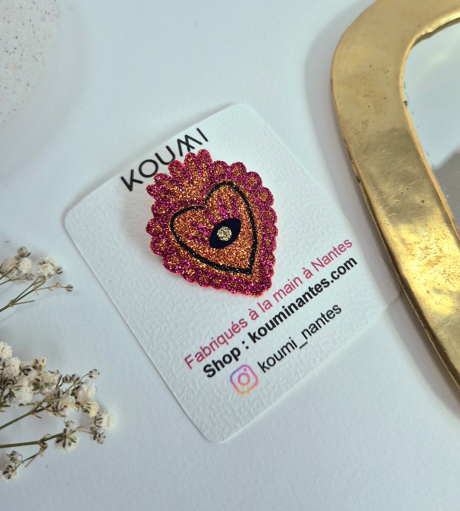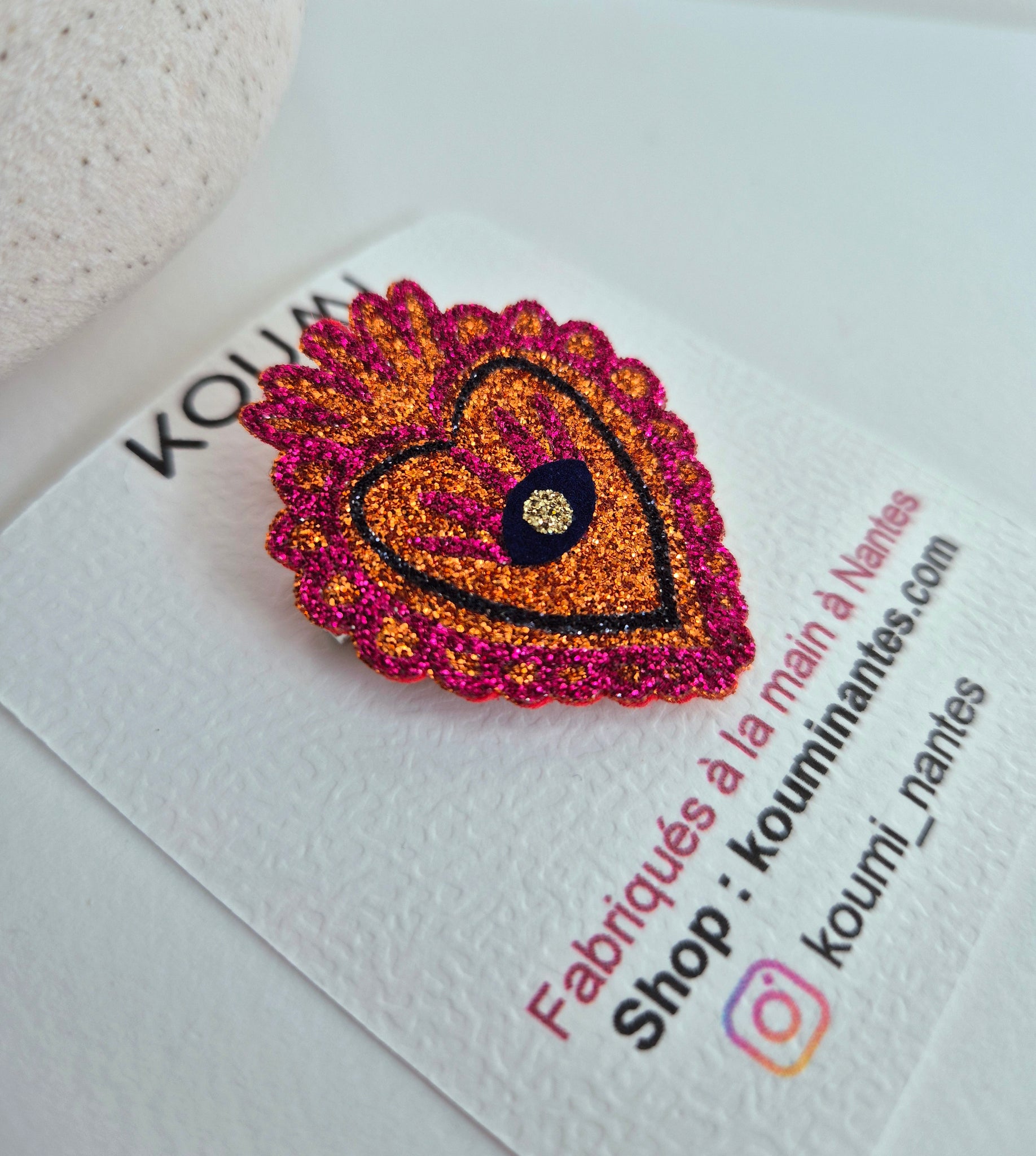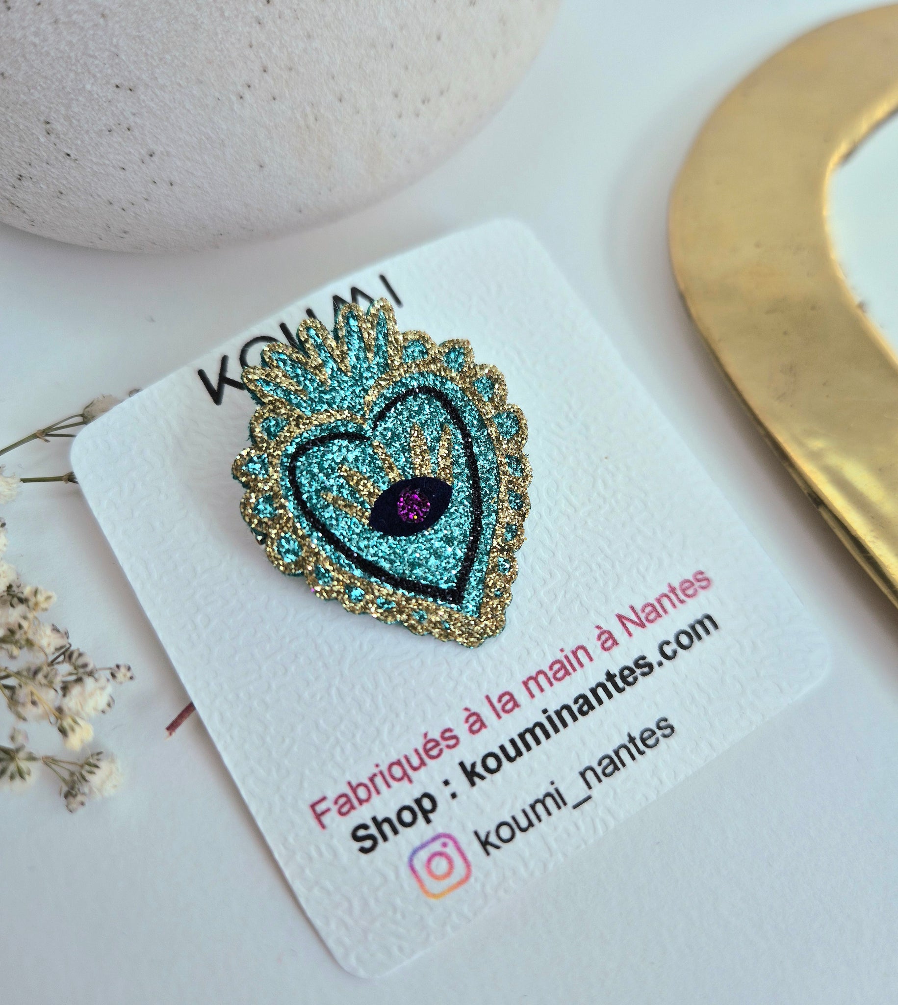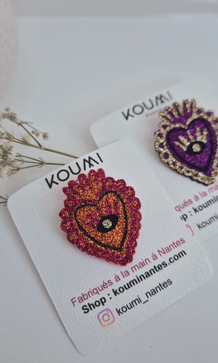 Ajoutez une touche de magie à votre style avec notre broche Cœur ex voto. Fabriquée à la main en feutrine et paillettes, cette broche est une explosion de paillettes et captent la lumière sous tous les angles.