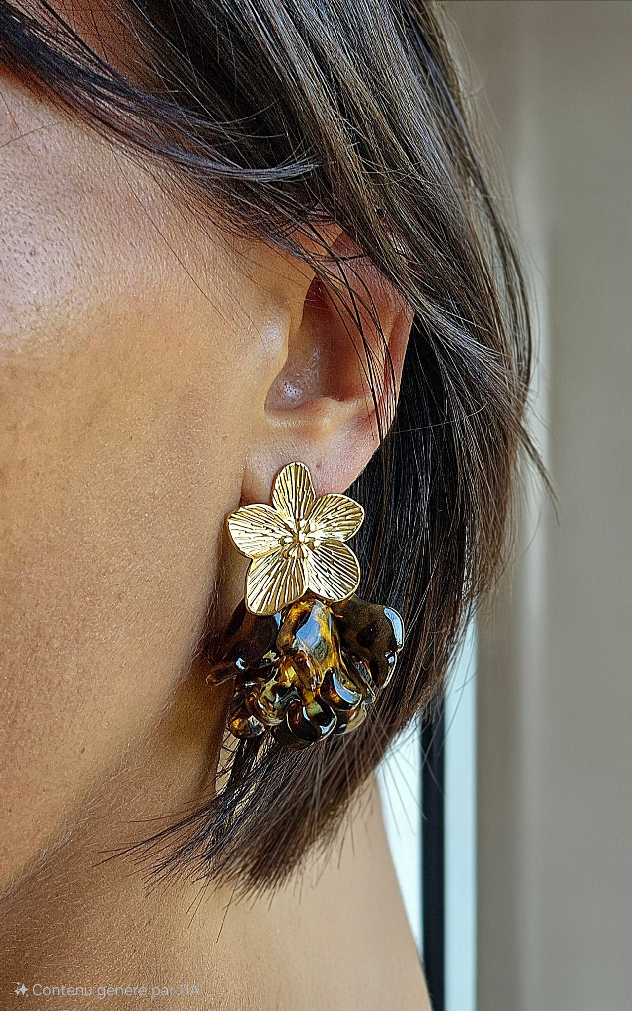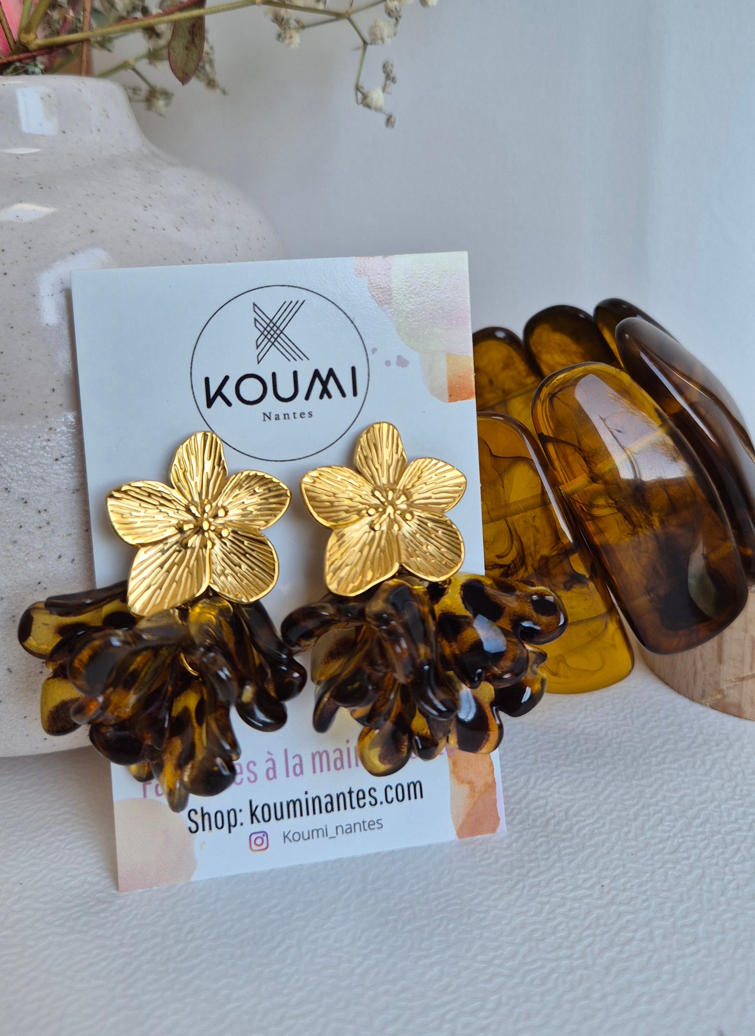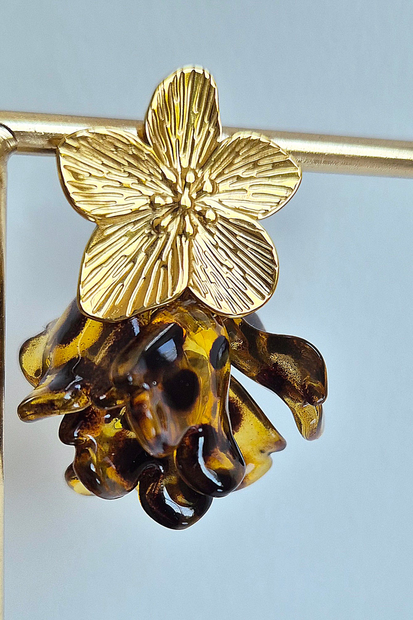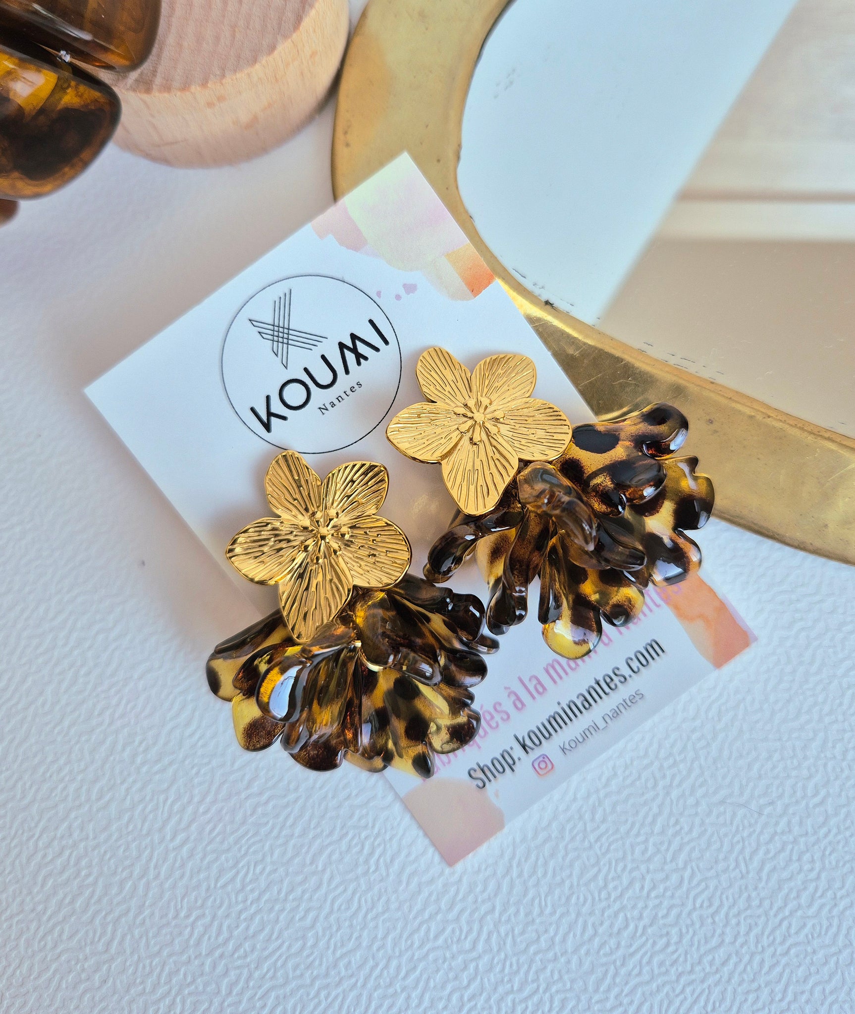 Ces boucles fleurs de cerisier sont en acier inoxydable travaillées avec une accumulation de pétales léopards.