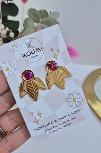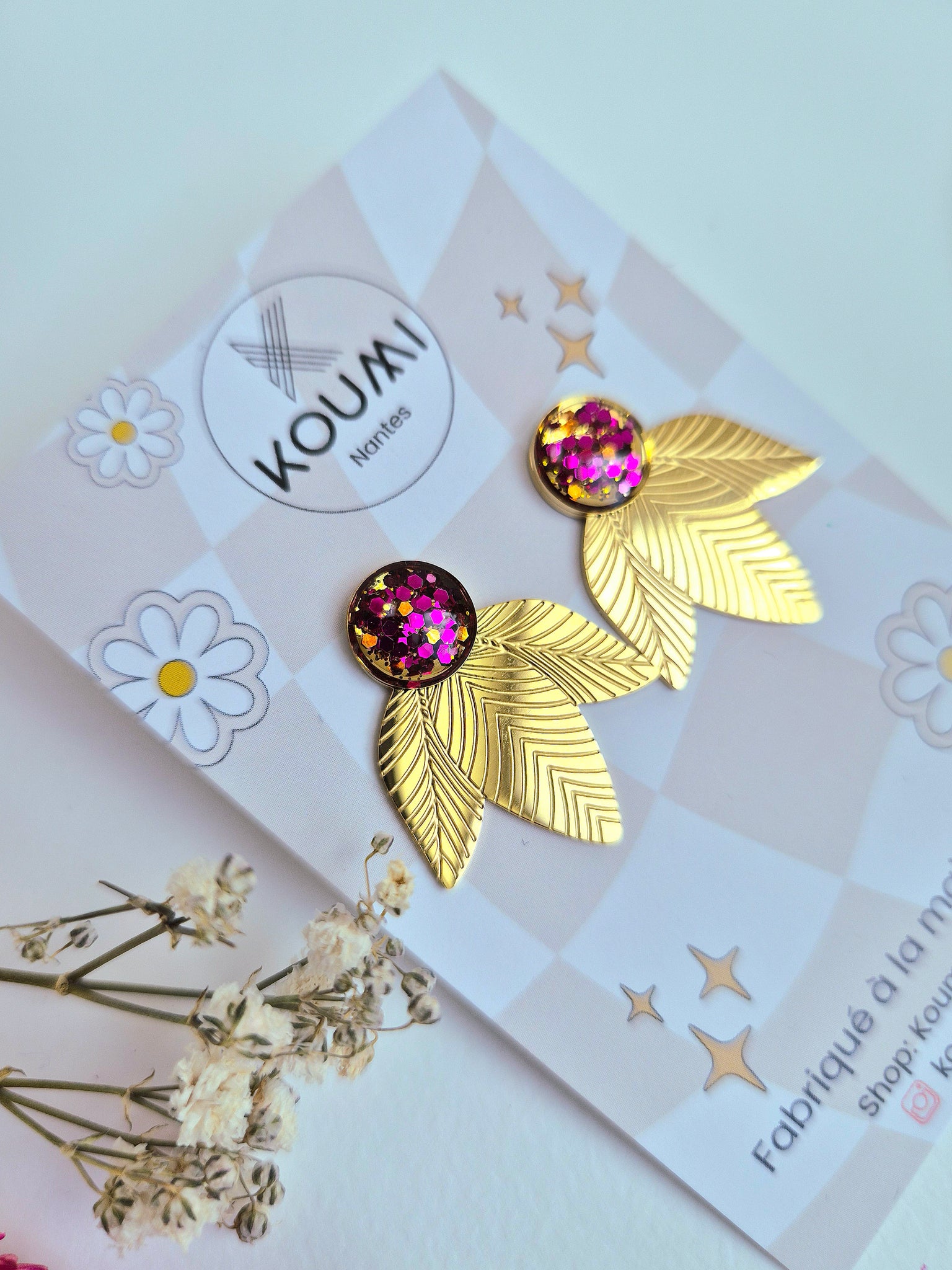Ces boucles en acier inoxydable sont travaillées à la main avec un insert en résine et paillettes.