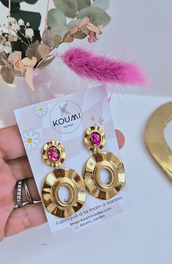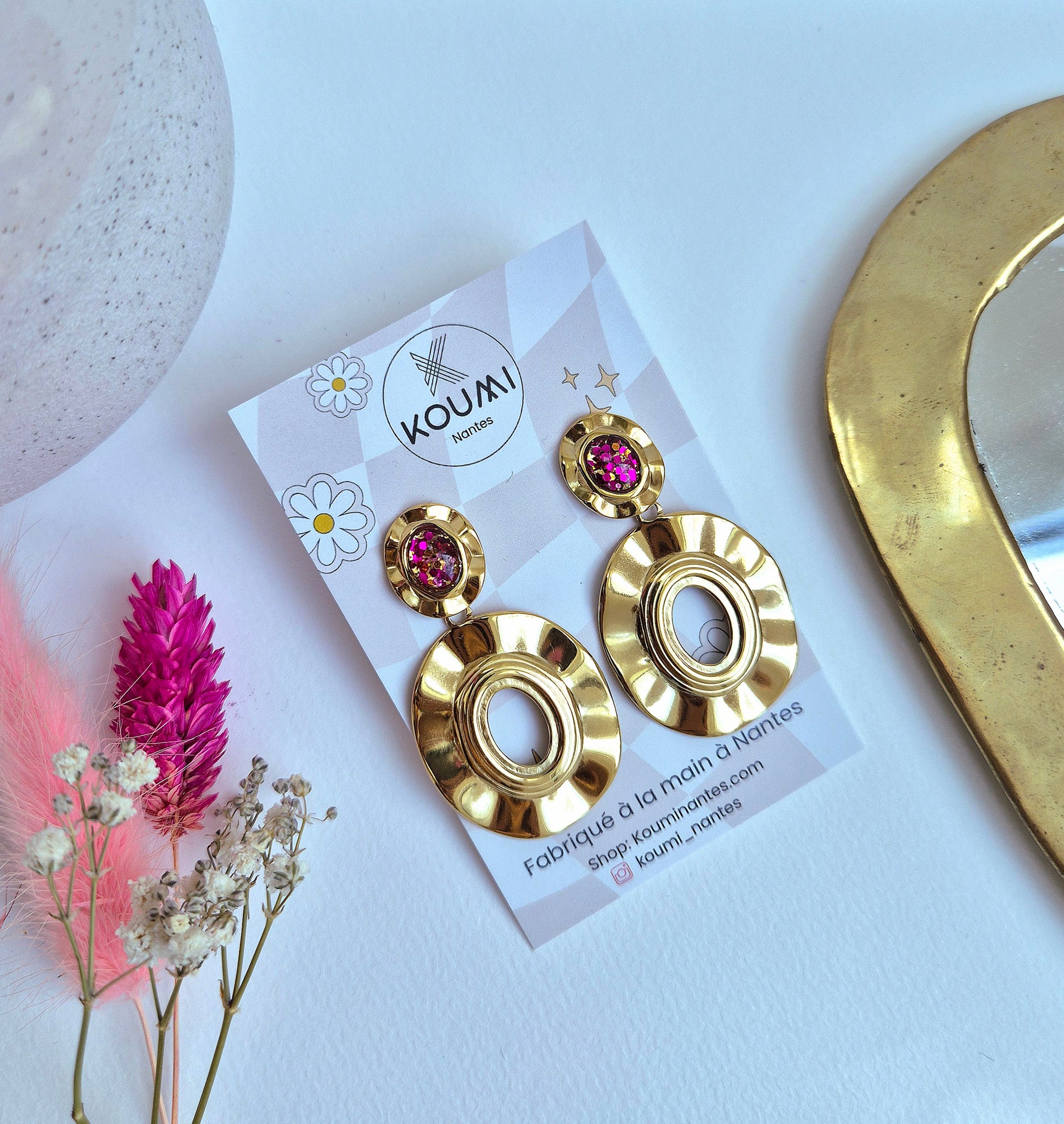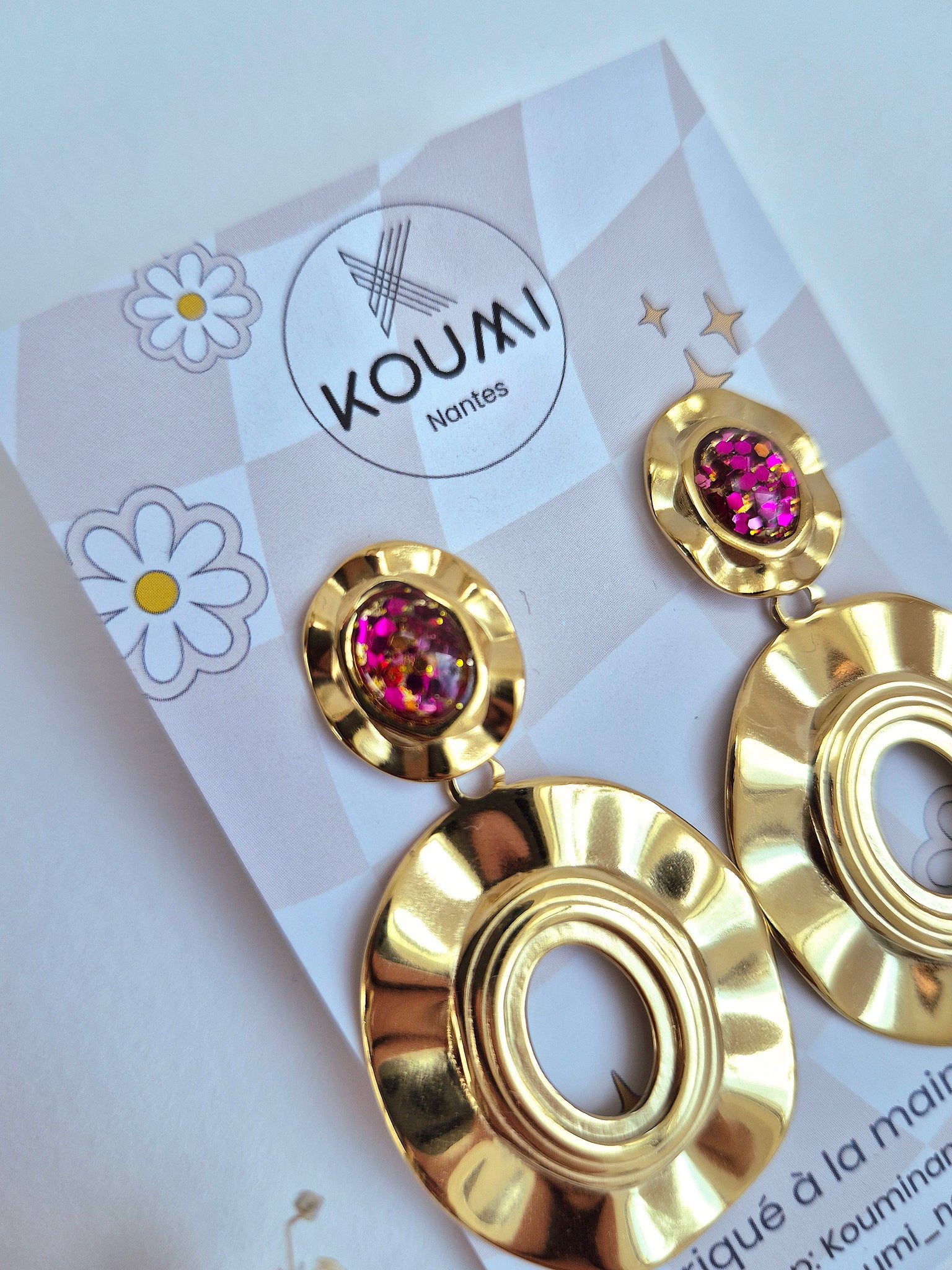 Ces boucles en acier inoxydable sont travaillées à la main avec un insert en résine et paillettes.
