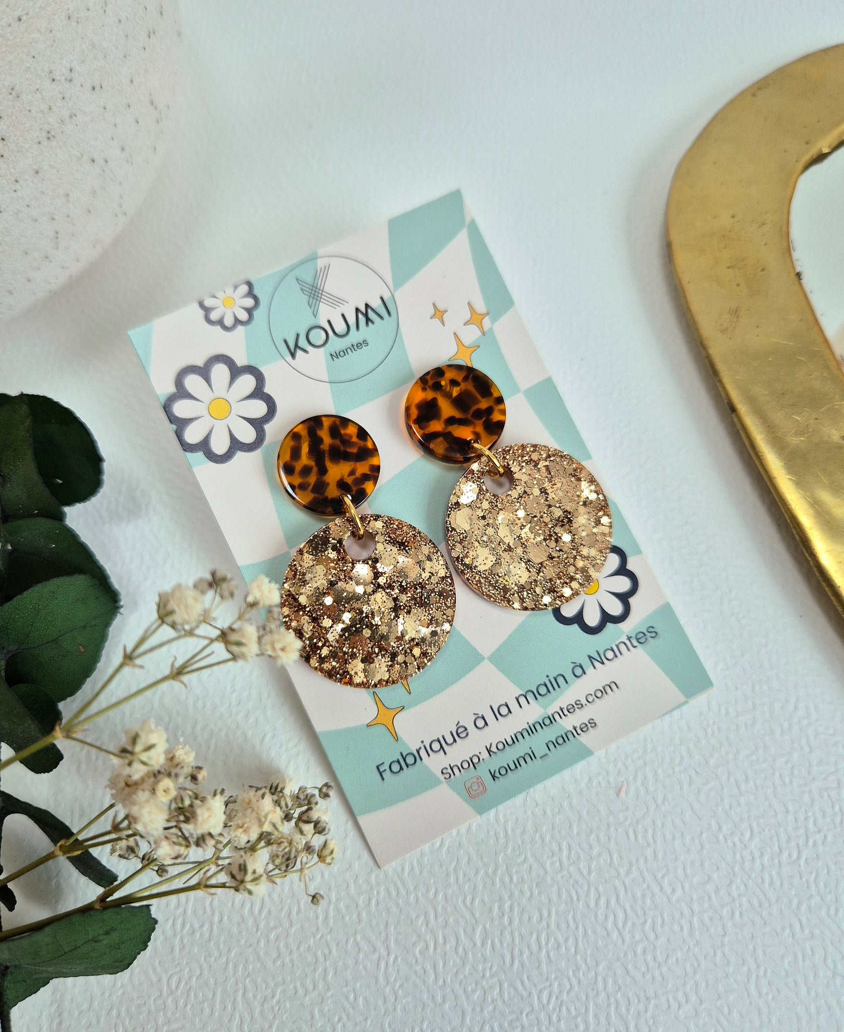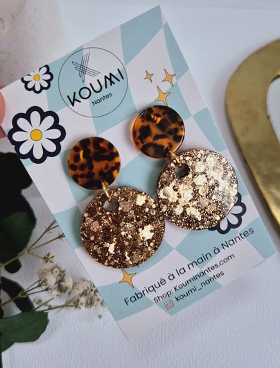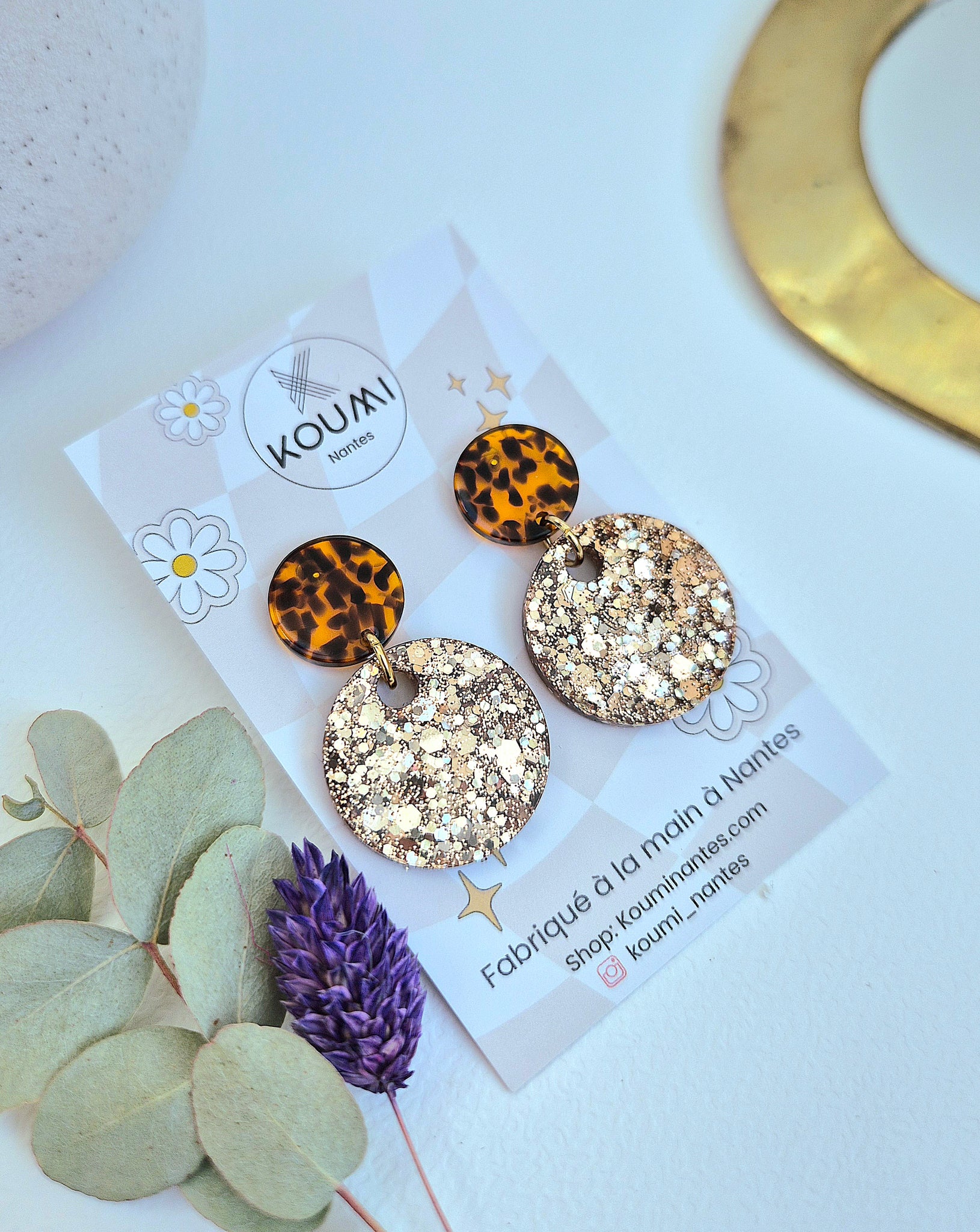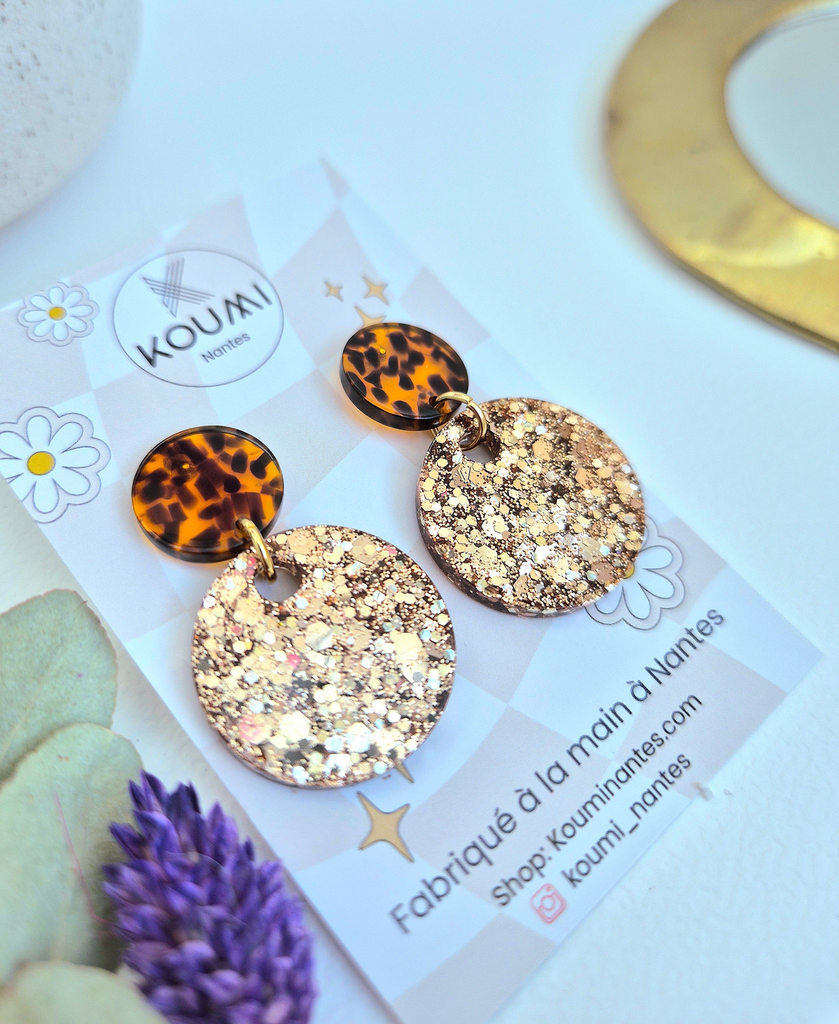 Ces boucles sont en acier inoxydable et résine biosourcée pailletée.