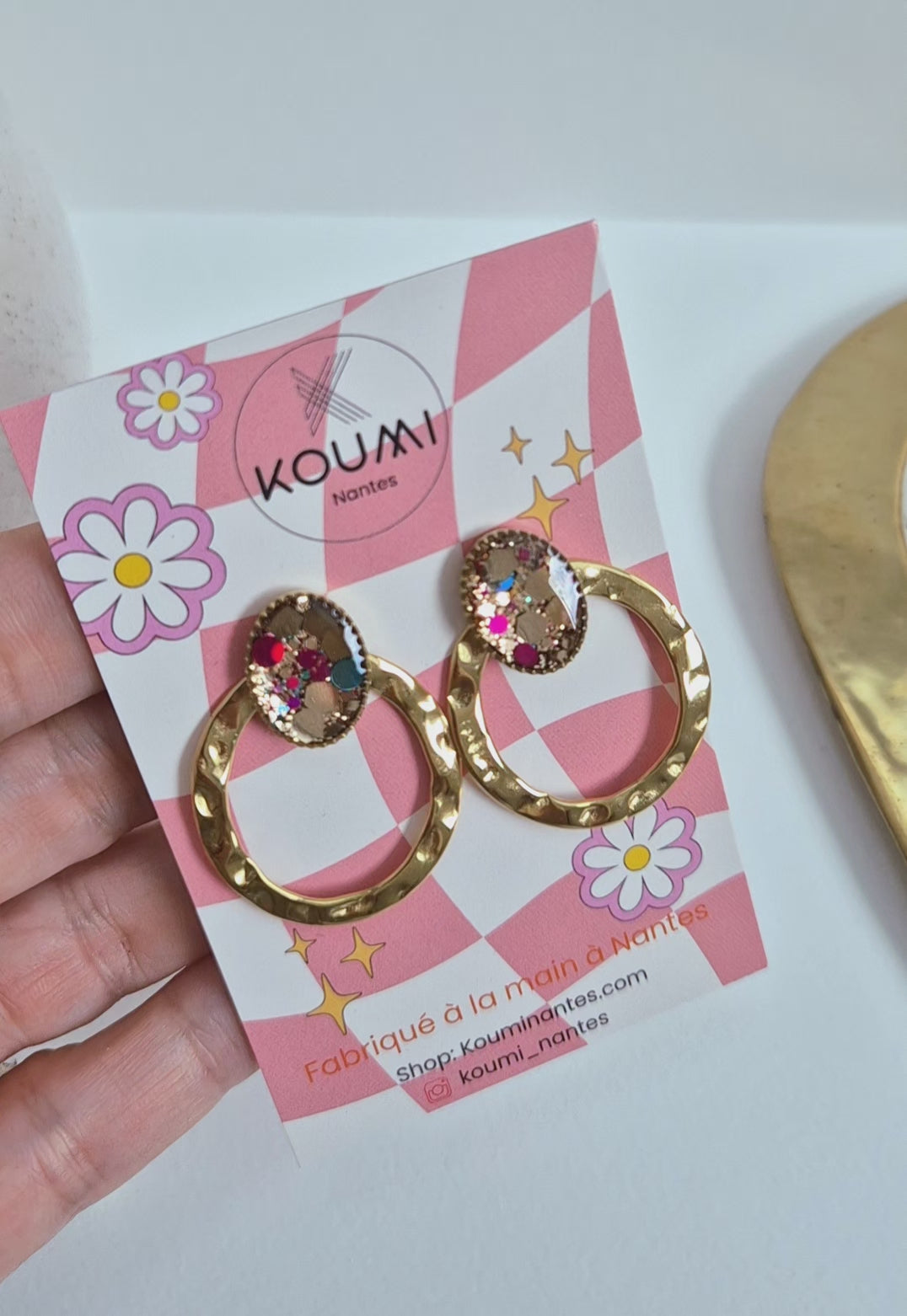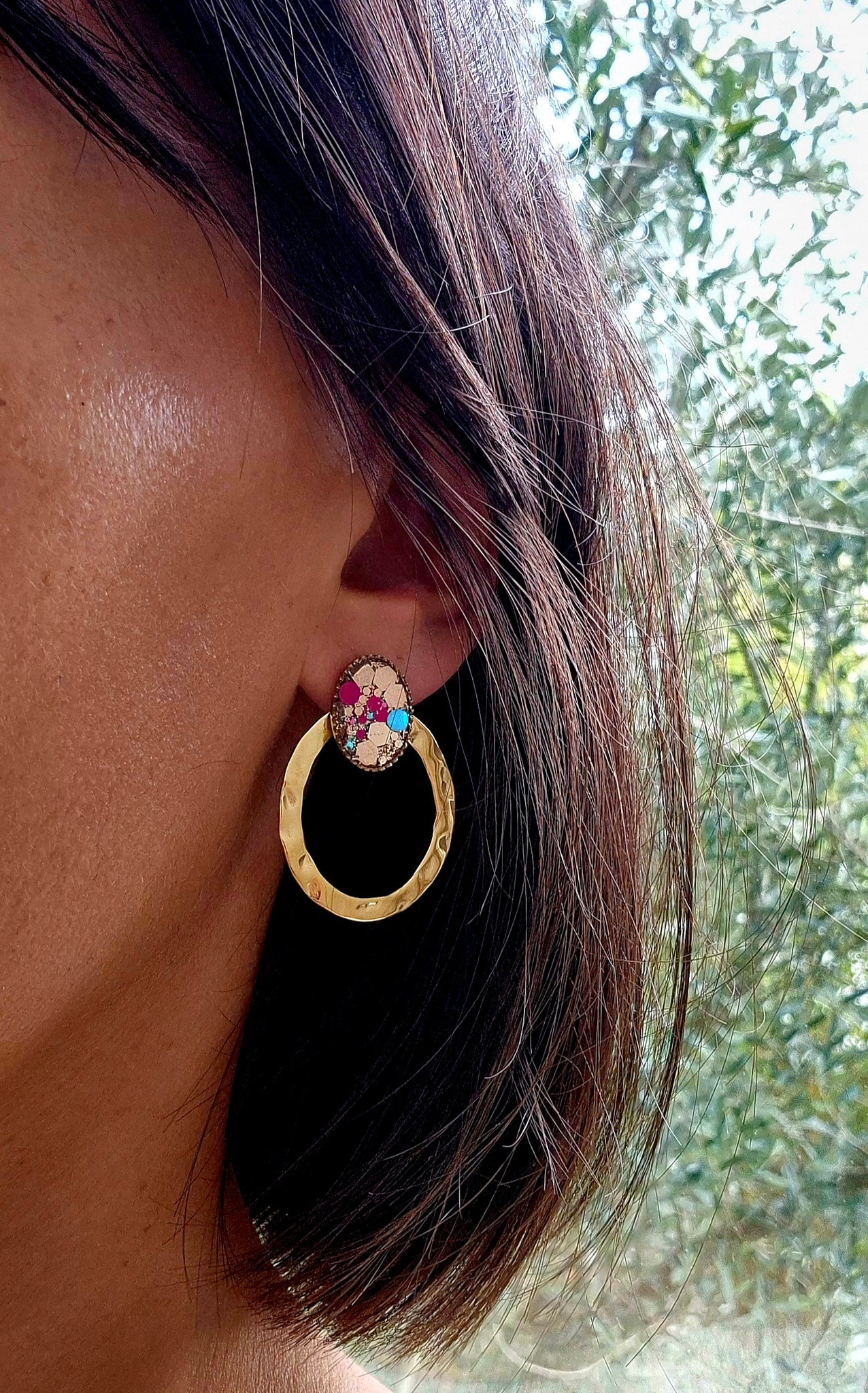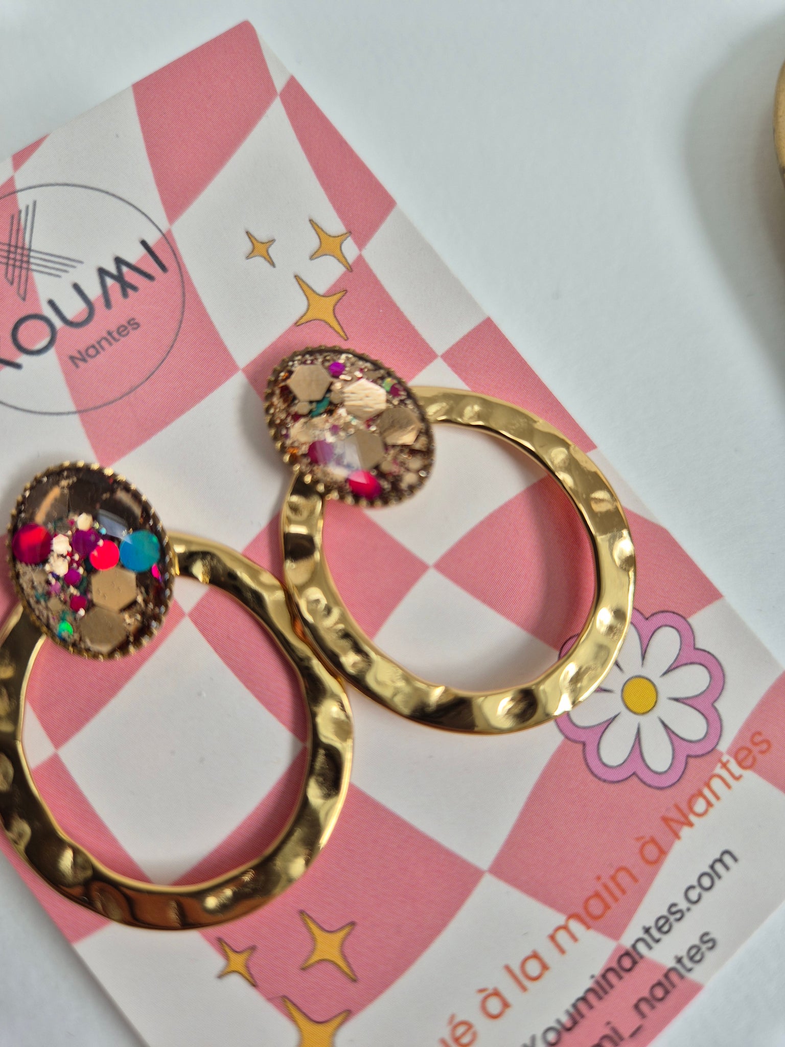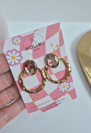 Ces boucles en acier inoxydable sont travaillées à la main avec un insert en résine et paillettes.