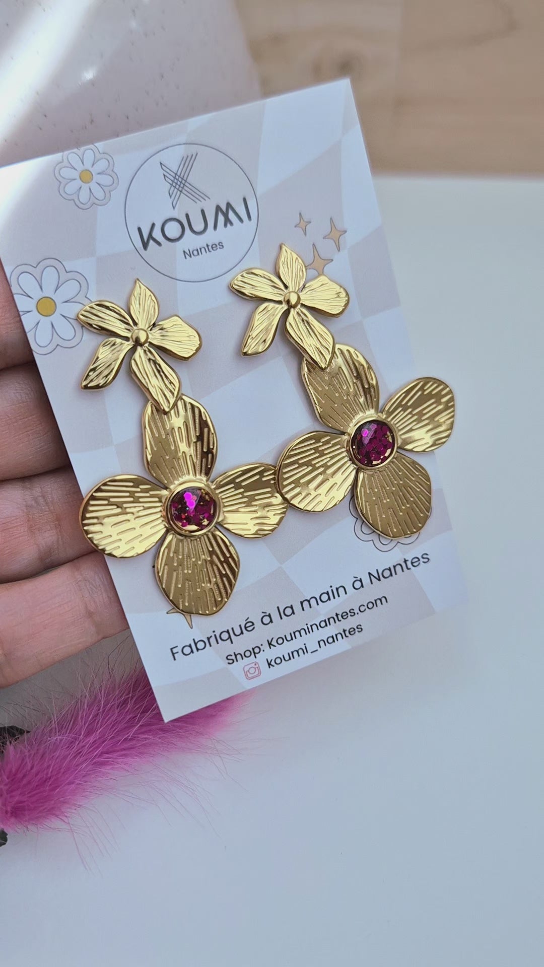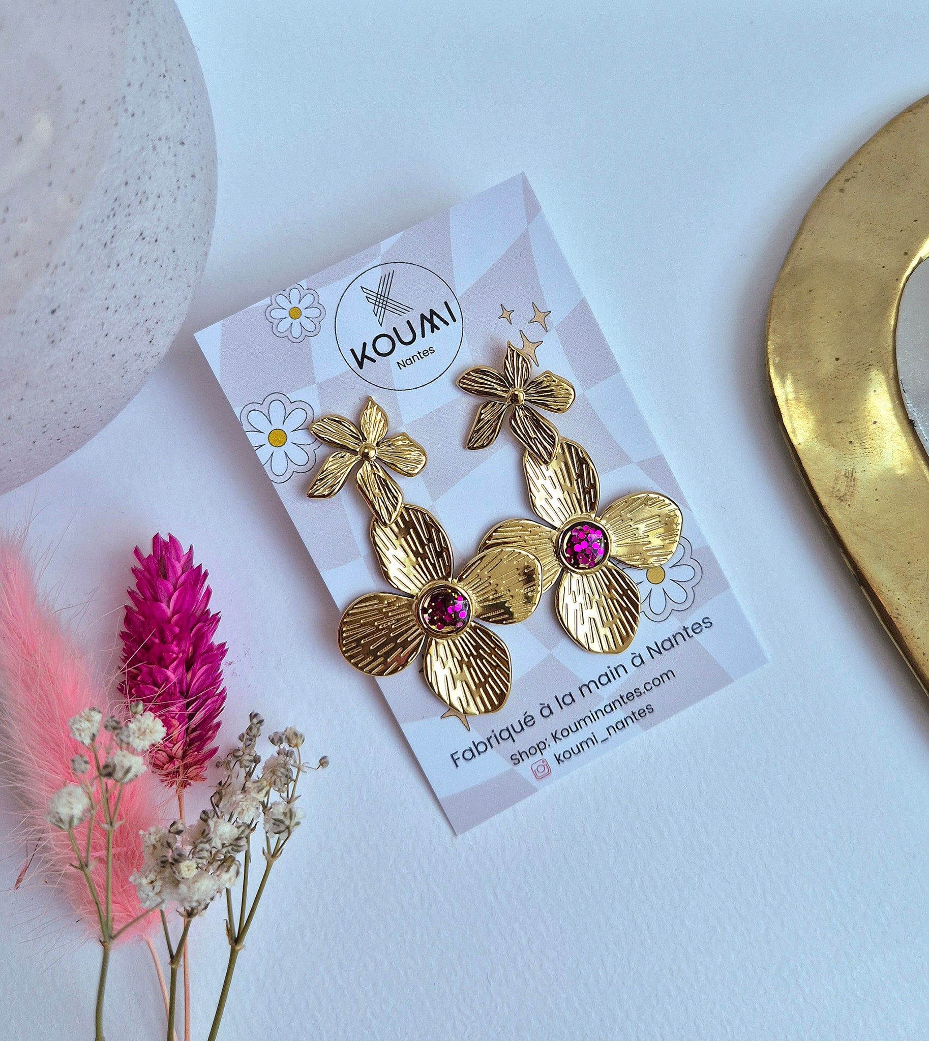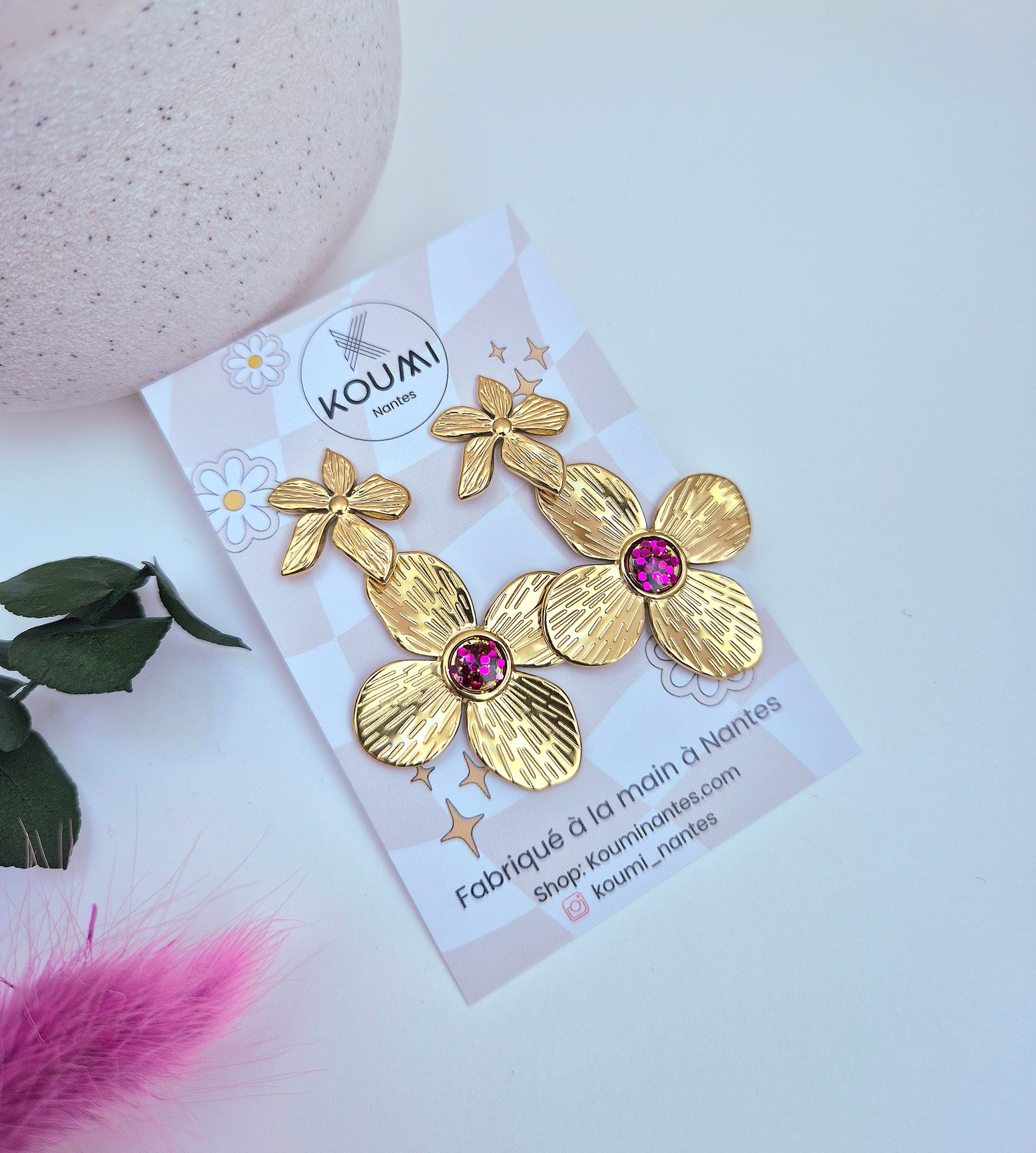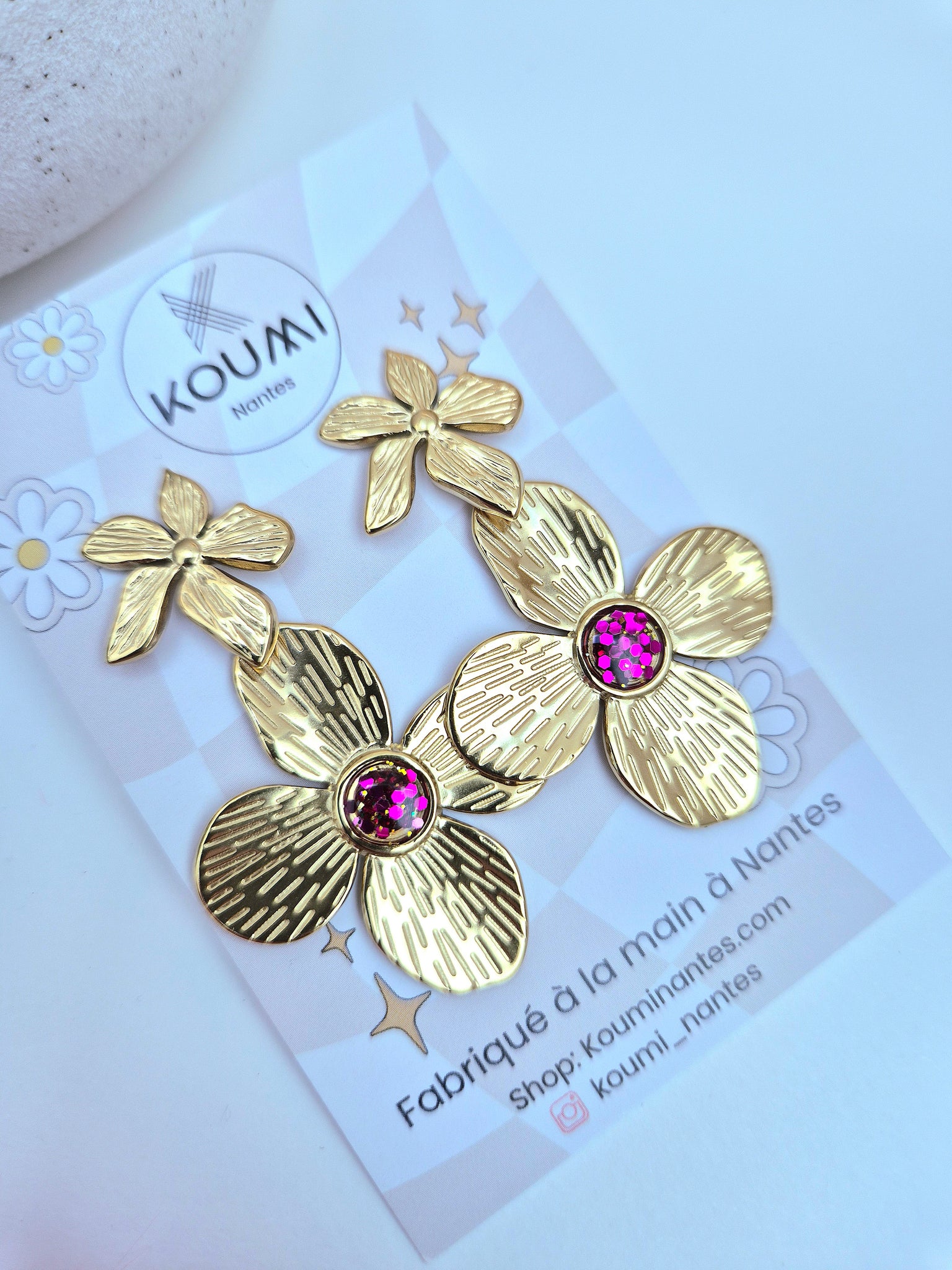 Ces boucles en acier inoxydable sont travaillées à la main avec un insert en résine et paillettes.