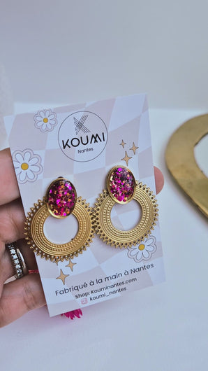 Ces boucles en acier inoxydable sont travaillées à la main avec un insert en résine et paillettes.
