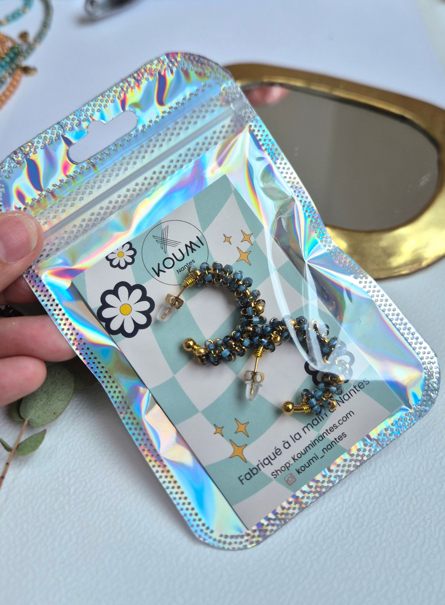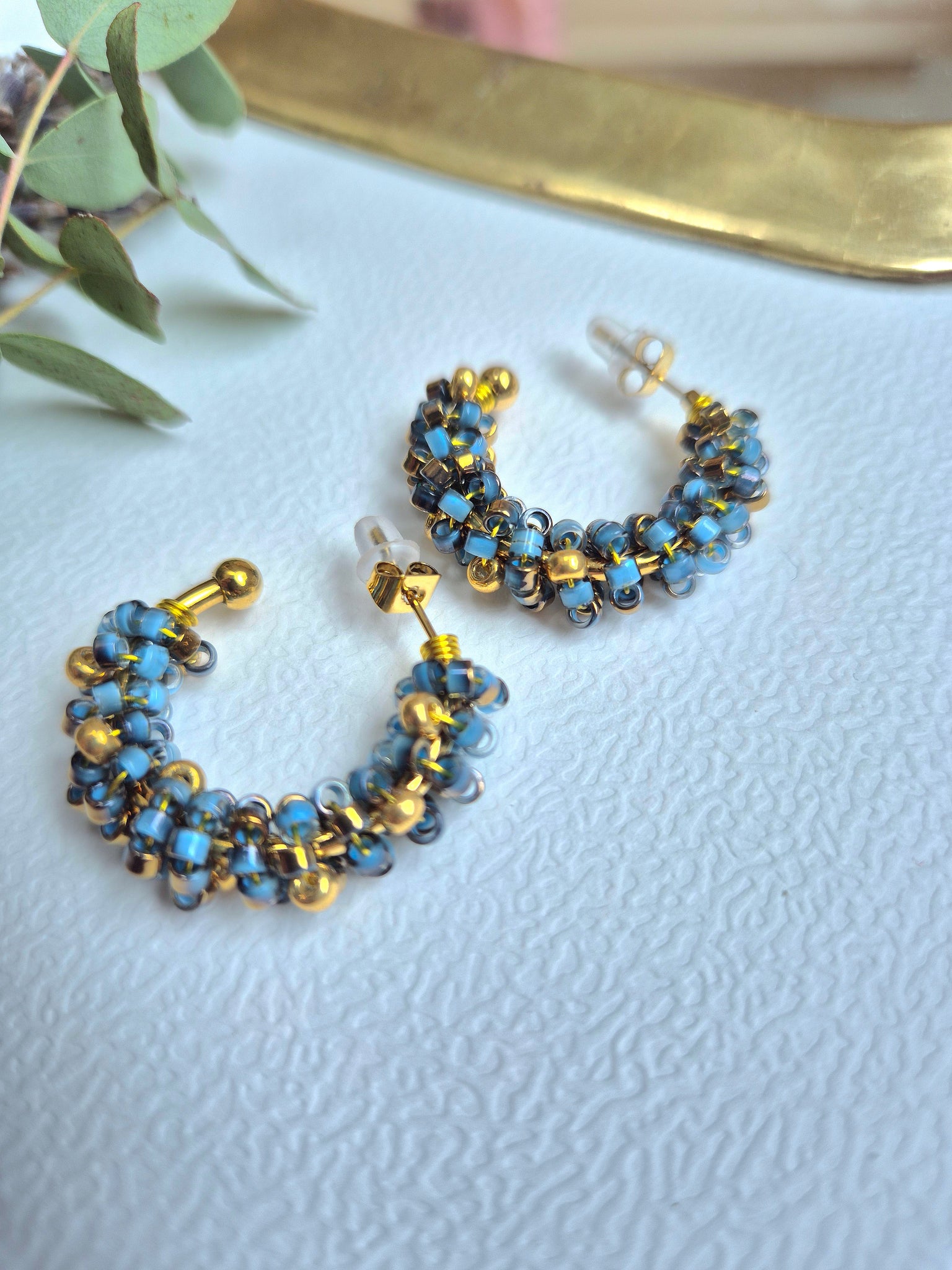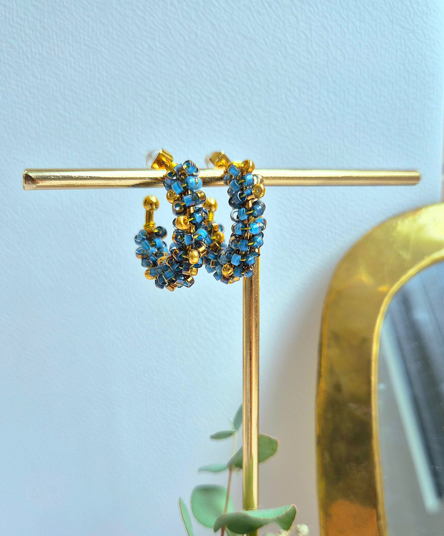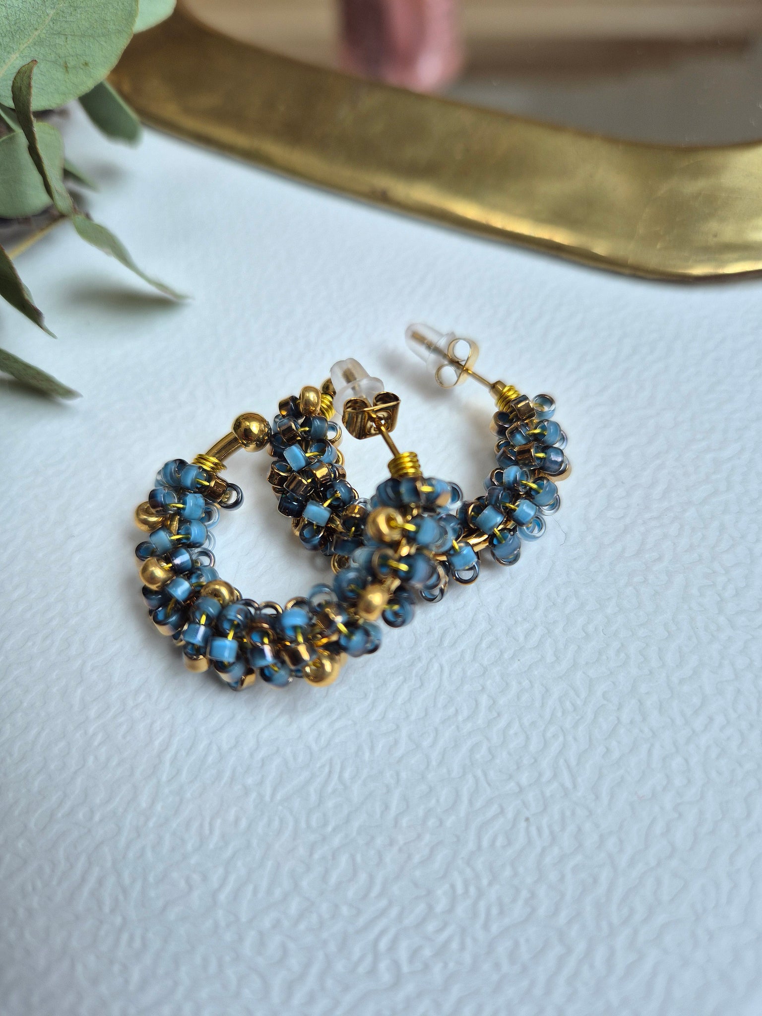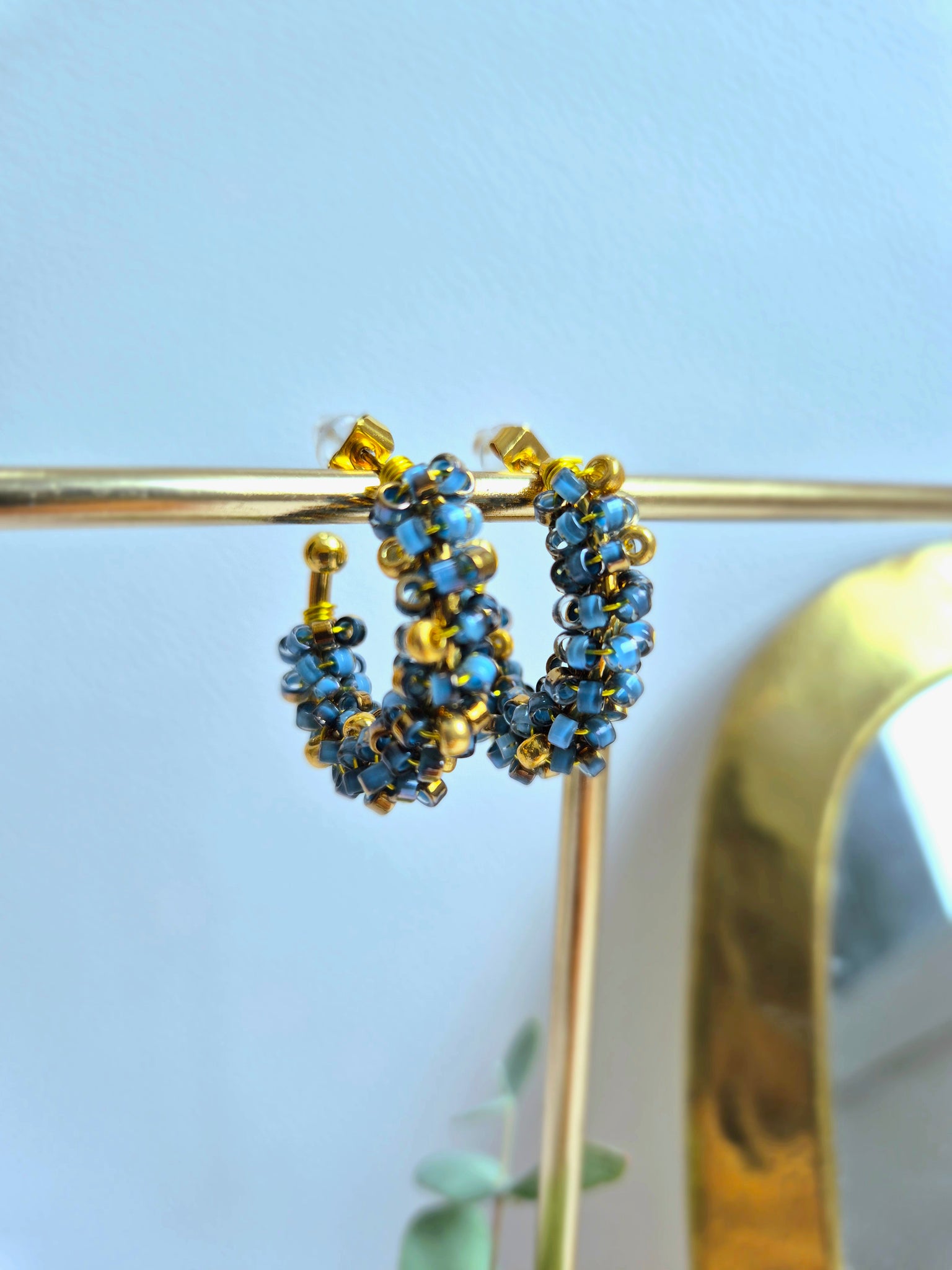 Tissées à la main avec un soin méticuleux, elles combinent de fines perles bleues irisées avec de délicates perles dorées, créant un effet scintillant et sophistiqué.