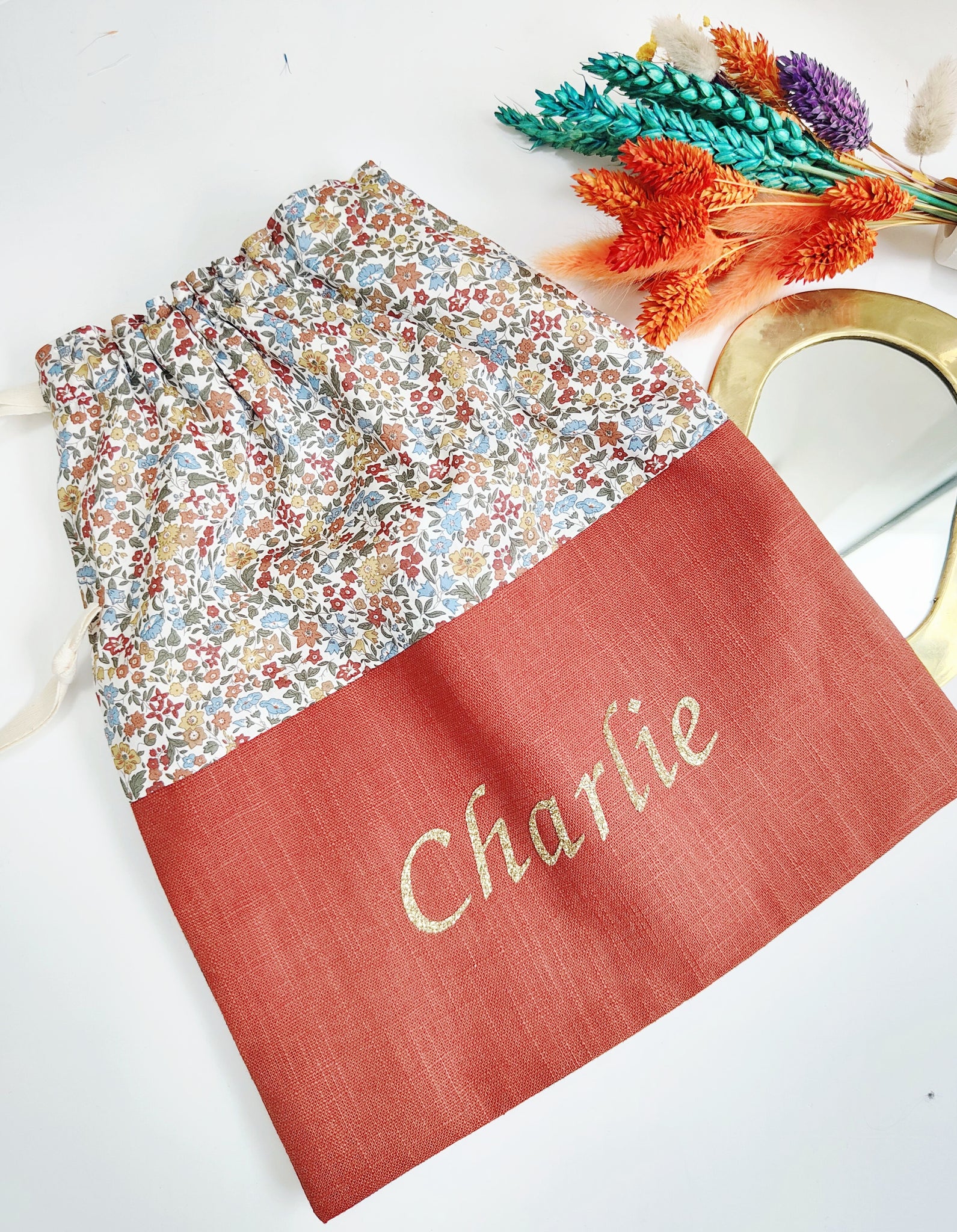 Sac en lin lavé terracotta et tissu liberty , doublé en double gaze de coton