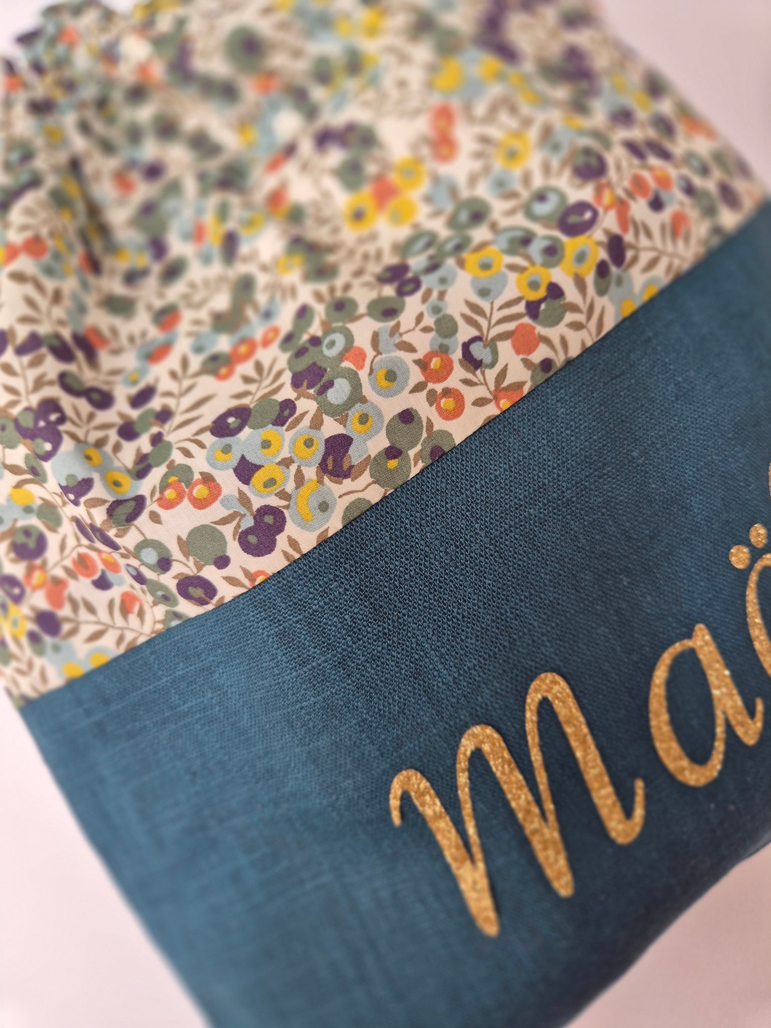 Sac en rami bleu canard et tissu liberty , doublé en double gaze de coton.